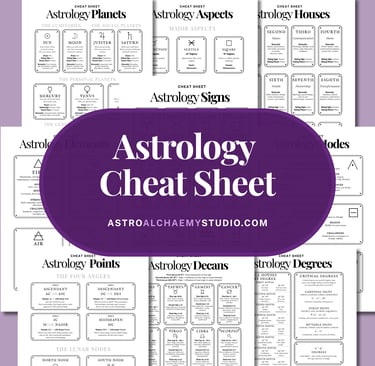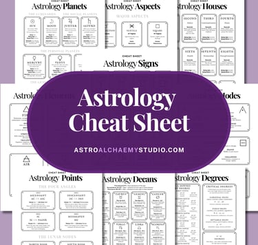 Unlock the secrets of astrology with this comprehensive digital cheat sheet. Featuring clear, accessible charts on planets, aspects, houses, signs, elements, decans, degrees, and more, it's perfect for both beginners and enthusiasts.